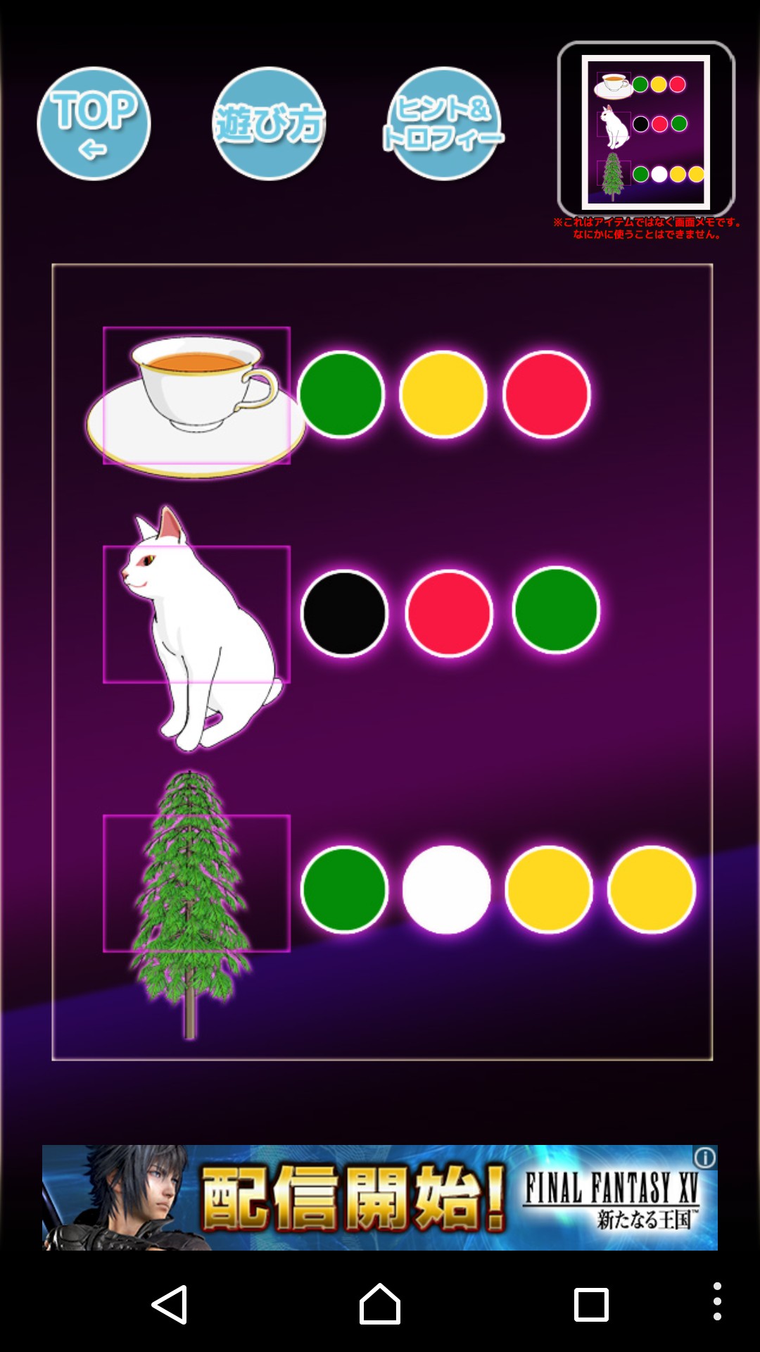 アイテム欄にも注意がありますが、使用中のアイテムは、「選択した状態で設置した場所をタップ」することにより、取り外して手元に戻すことができます。アイテムは選択しているものひとつしか謎解き画面に表示されませんが、アイテム欄をタップすると所持しているアイテムの一覧が表示されるので、ここでアイテムを切り替えます。クリアにあたってこれは重要な情報なので、覚えておきましょう。レビューを見ていてもこの操作でつまづいたユーザーが多かったです。