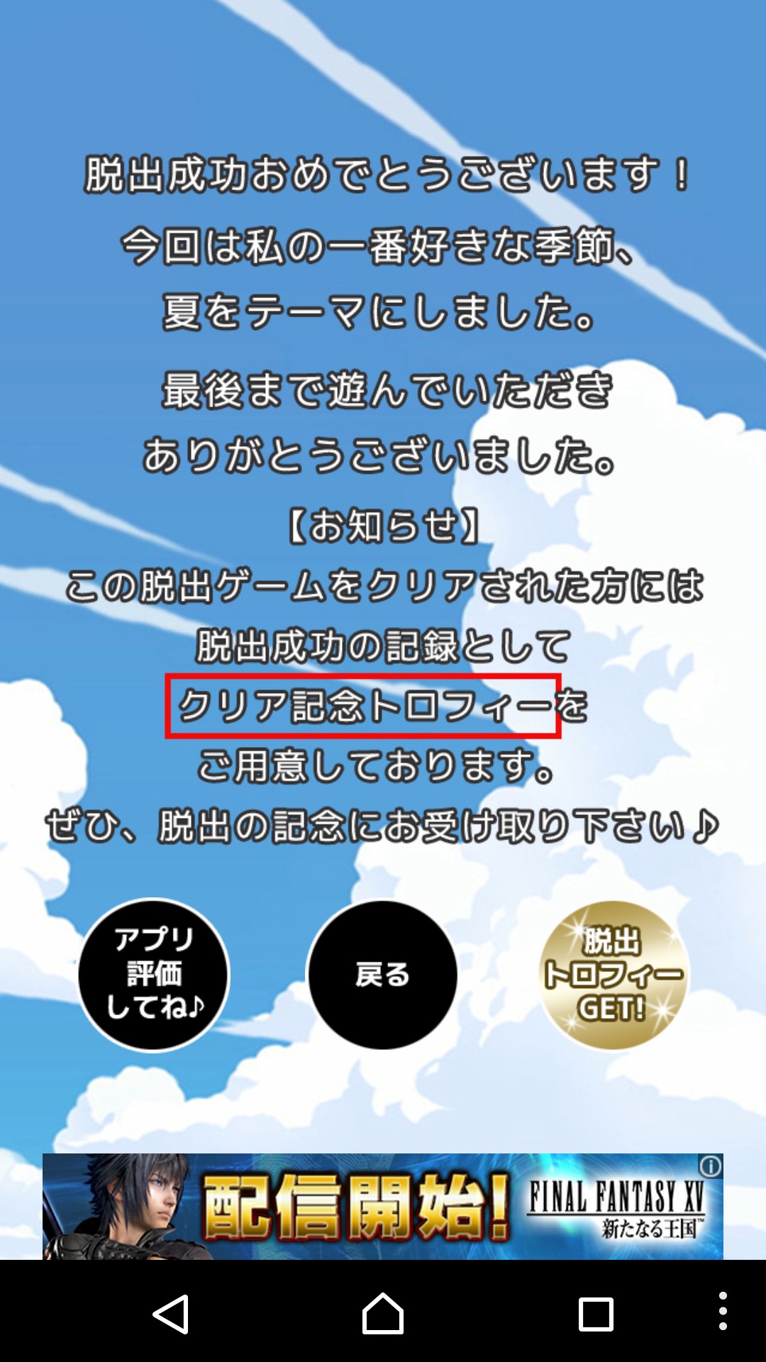 攻略が完了すると、開発者からトロフィーがもらえます(もちろん、本物ではありません)。BBSで作成したニックネームで申請できますので、興味のある方は申請してみてください。