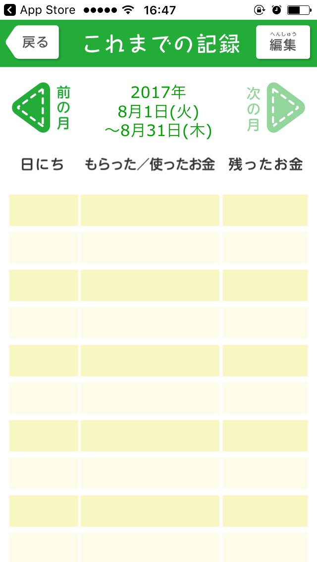 「これまでの記録」をタップすると、月ごとのカレンダーがあり、もらったお金・使ったお金と、残ったお金が通帳のように表示されます。前の月、次の月に簡単に移動できるので、後からチェックしたいときはすぐ見直すことができます。