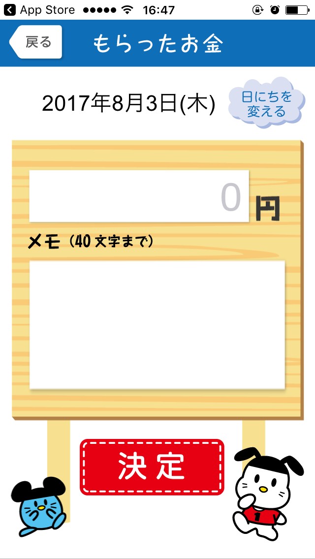 目標とお小遣いの設定が終わったらいよいよ貯金のスタートです。「もらったお金」と「使ったお金」をタップすると、日付ごとに金額を入力する欄と、誰からいくらもらったのか、何を買うのにいくら使ったのかなどを入力できるメモ欄が表示されます。