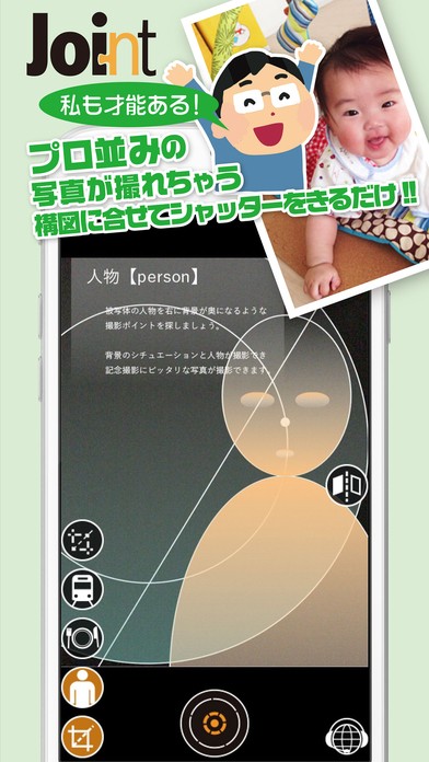 撮影をするときに、サンプルのラインが表示されます。人物を撮る場合にはラインでどの位置に人物をおけばいいのか角度などを示してくれます。この通りに撮影することで綺麗な写真ができます。因みにこのラインは非表示にもできるので慣れたら非表示にして撮ってみるといいです。