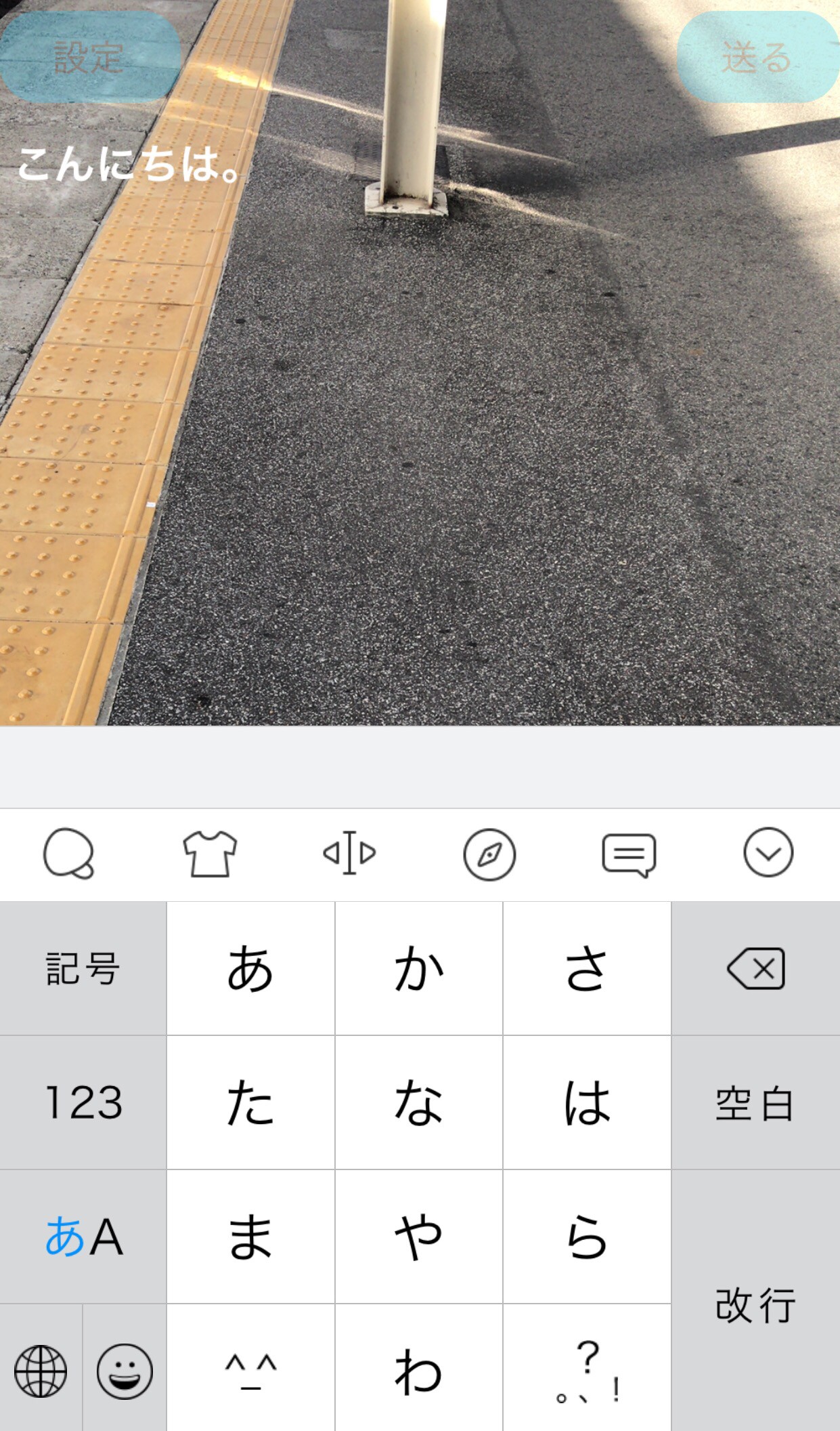 アプリを起動すると、このようなカメラの画像が表示されます。このアプリで文字の打ち方は、とってもかんたん。メールやSNSの文字を打つように、スマホのキーボードを使って文字を打っていくだけです。
