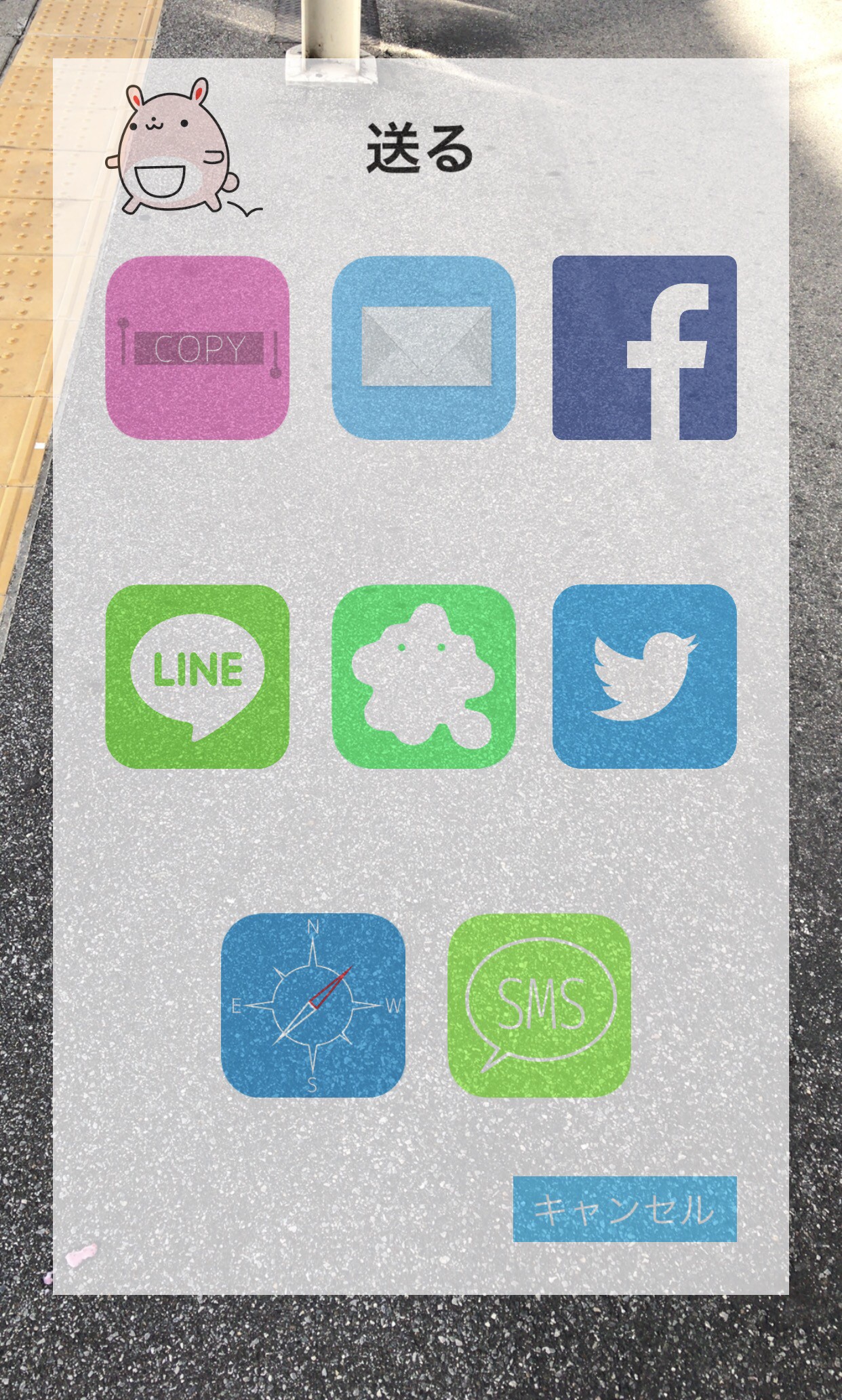 アプリで文字を打ち終わったら、「送る」をタップで、メール、facebook、LINE、Ameba、Twitter、SNSなどにそのまま投稿したり、本文に反映したりすることができます。