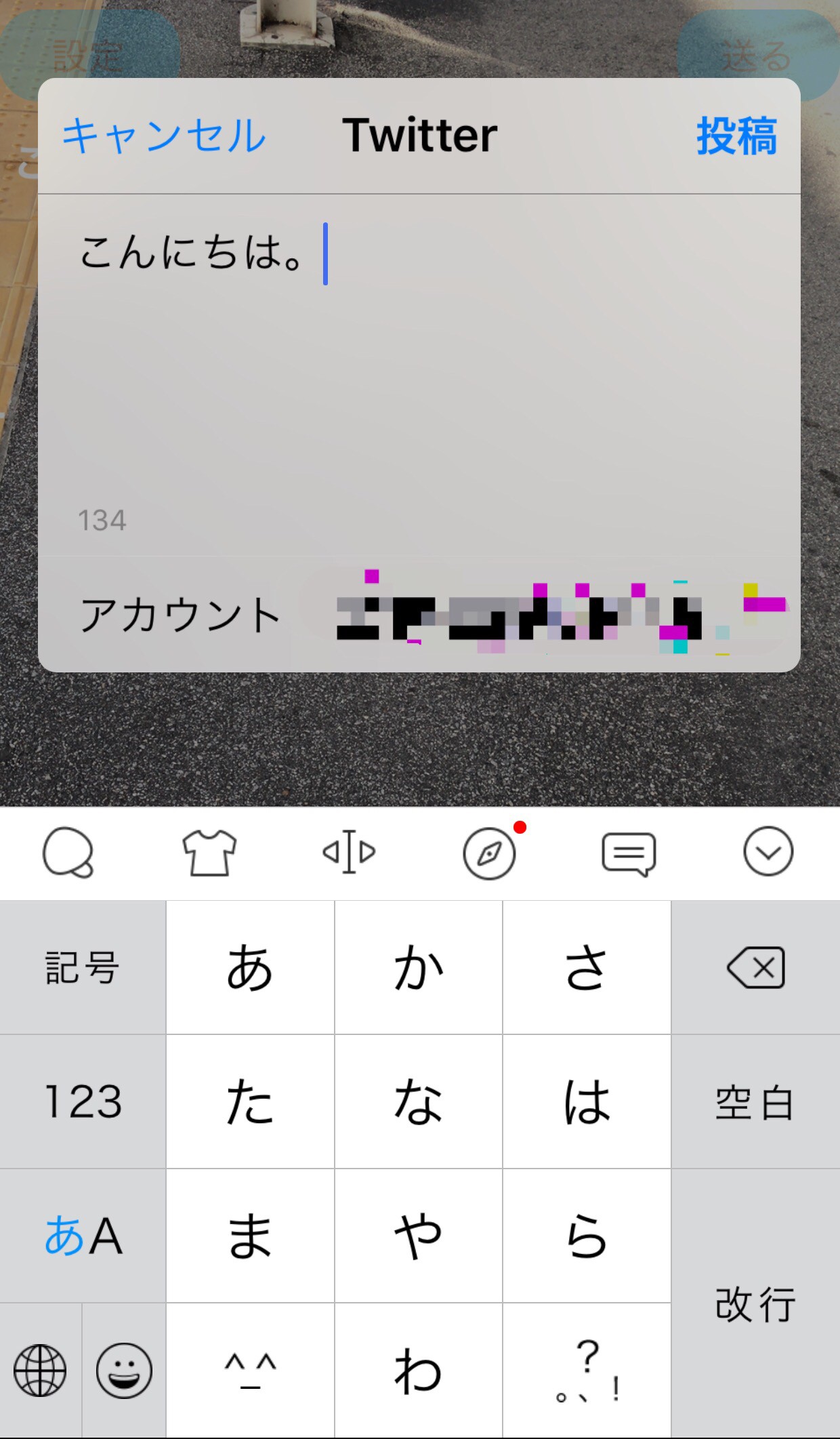 例えば、アプリで打った文字をTwitterに送る場合。「送る」をタップした後に「Twitterのアイコン」をタップすると、このようにログインしているTwitterアカウントに投稿できる画面が表示されます。このTwitter投稿画面で「投稿」をタップすると、Twitterに投稿が完了します。