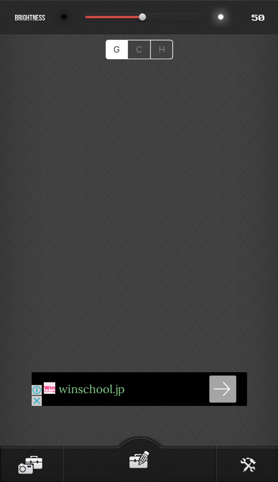 加工をするには、アプリを起動し画面左下の「道具箱とカメラがあるアイコン」をタップします。「道具箱とカメラがあるアイコン」をタップすると、このような画面が表示されますので、画面下真ん中に表示される「道具箱とペンのアイコン」をタップします。