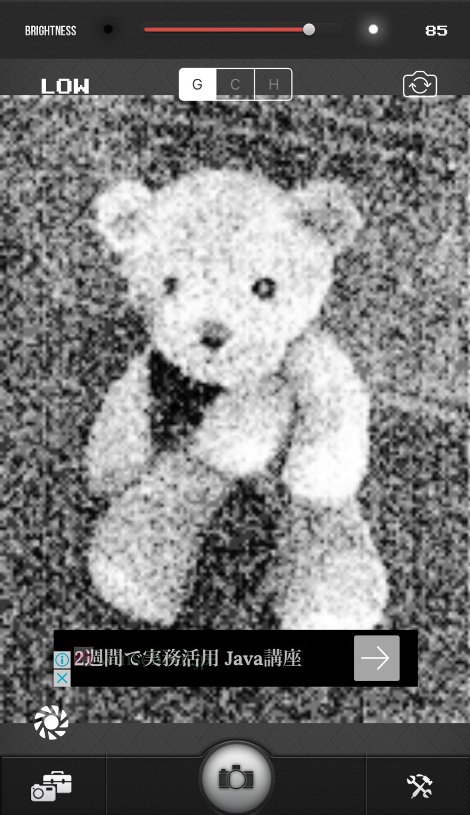 このアプリは、写真の粗さを3段階で調節することができます。画面左上の「LOW」という文字をタップしていくと、粗さの調節ができます。アプリを起動した、この画面では「LOW」。