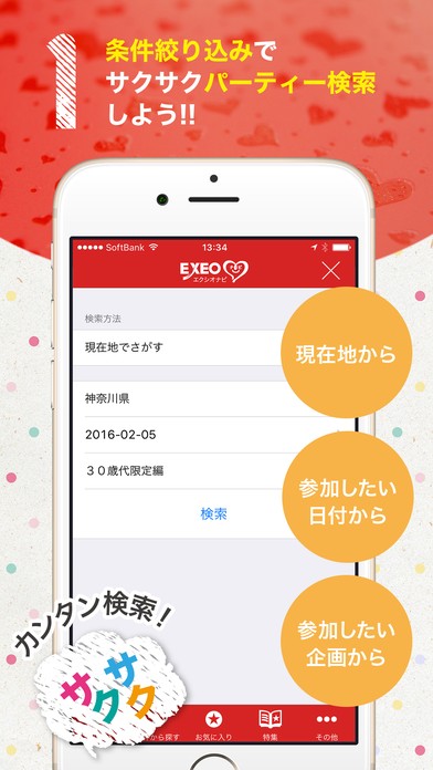 - 「エクシオナビ - 婚活パーティー お見合いパーティー」は、日付や条件、企画からお見合いパーティーの検索可能!