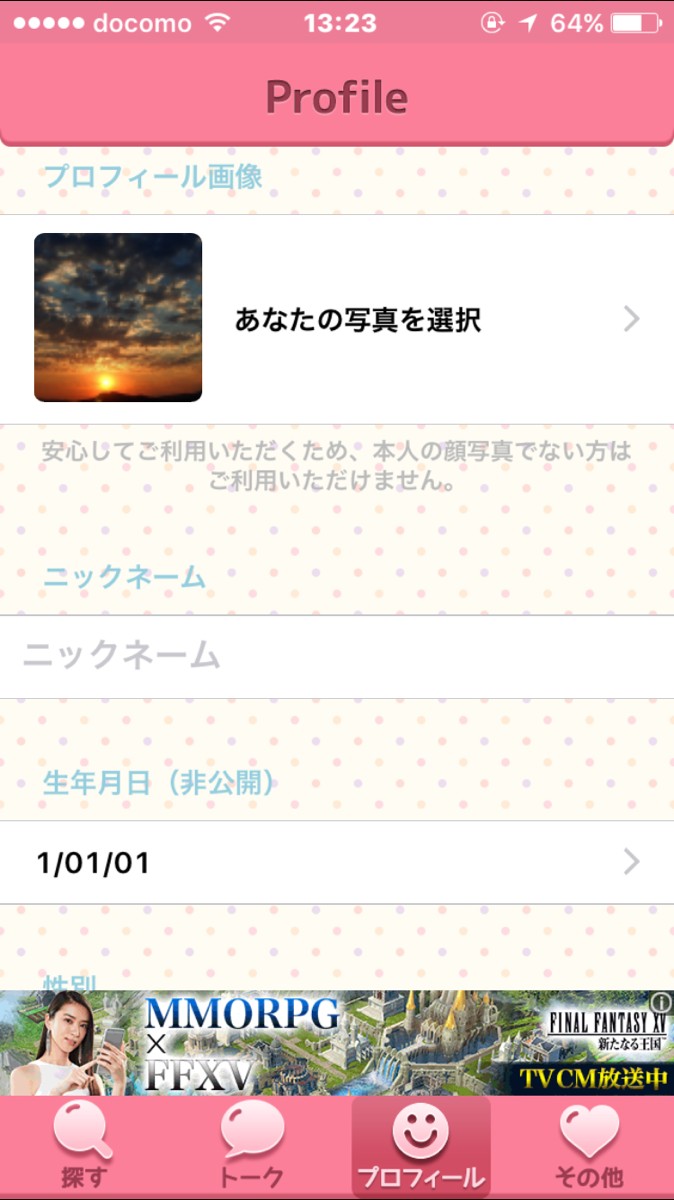 名前の登録もニックネームのみ、誕生日の記入は非公開、住所などの個人情報は記入なしなので安心です。