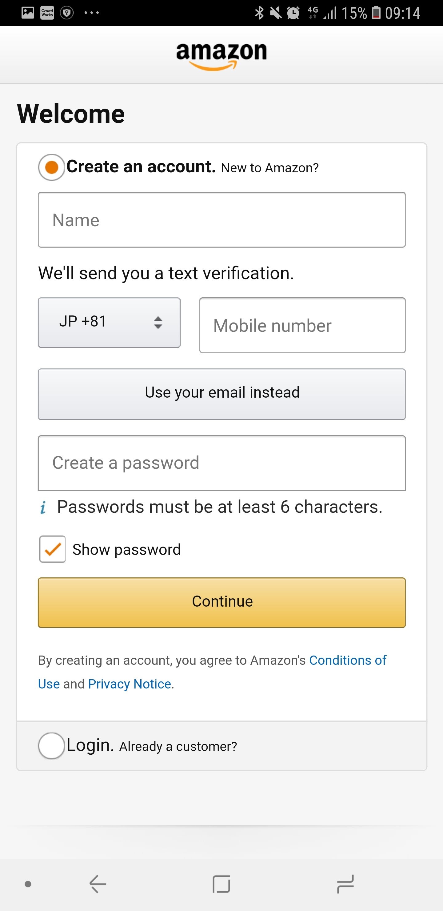 • Mobile number: 携帯電話番号(日本の場合、+81を選択し、頭の0を除いた電話番号を入力)