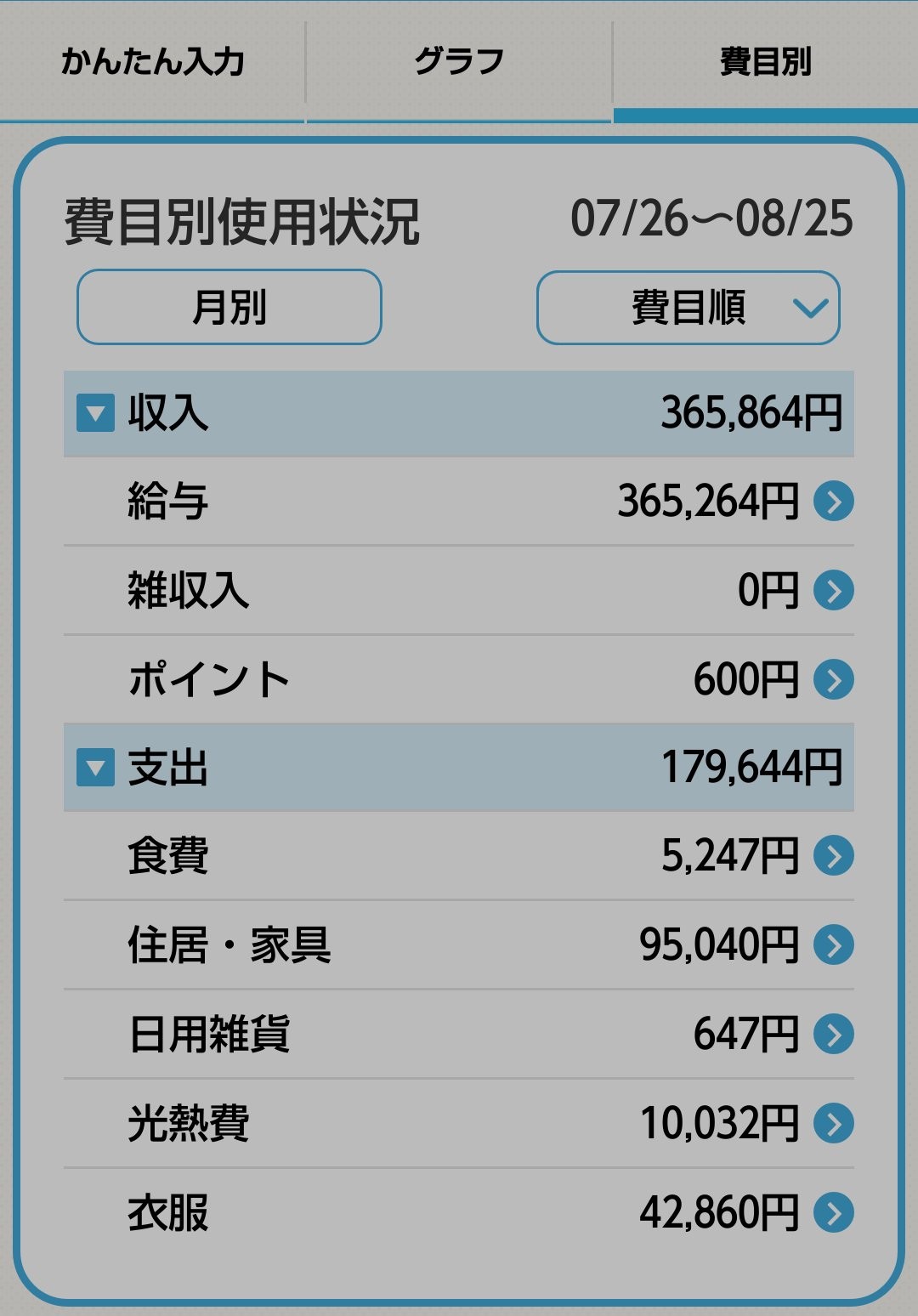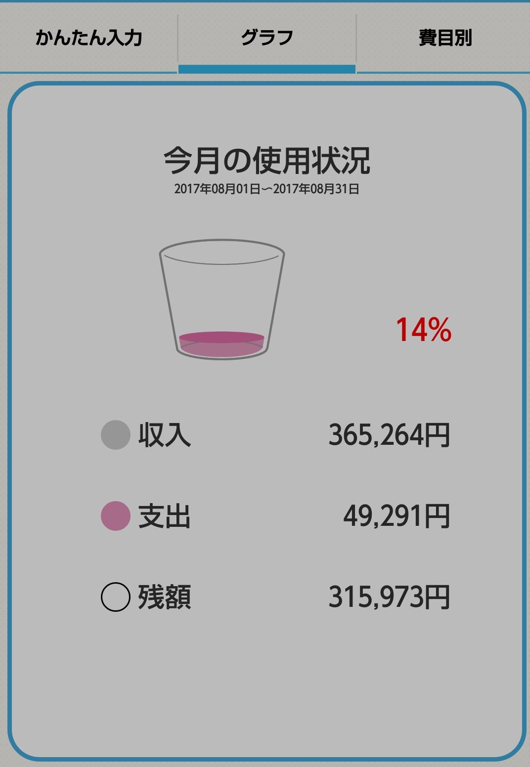 グラフ画面では収支額が表示され、今月の使用状況として収入に対する支出の割合がグラフ化されます。