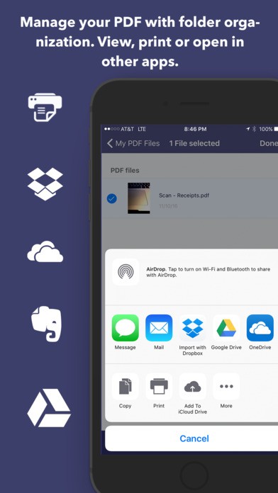 「Jet Scanner」 は電子メールサービス、クラウドストレージサービスやソーシャルメディアに文書をアップロードしたり送信したりできるので、共有目的での便利ツールとしても使用できます。操作はとても簡単で、あらかじめ保存した文書をPDFに変換可能です。また、その際、画像や書面ファイルの容量が大きいとアップロードできないため、調整が必要です。