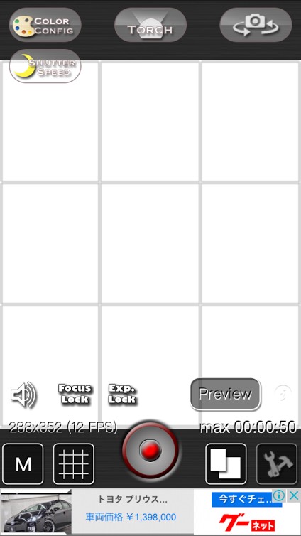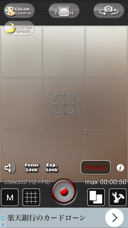 「夜撮ムービー Lite」のアプリにはいくつか便利な特徴があります。まず基本的な要素ですが、明るさ・カラー調整が可能です。便利なプリセットが多数搭載されています。 カラー調整をリアルタイムに確認しながら撮影することもできます。 シャッター速度調整 (1/30 〜 60sec) も可能です。 更にタイムストレッチも可能です。 シャッター速度に応じて、調整範囲は変わるので確認しましょう。1/5倍速〜3600倍速です。超微速度撮影では月の軌跡を撮影したり、花が開く様子を撮影することができます。タイムストレッチ設定によっては音声が自動的に禁止になることもあるのでこちらもその場で確認しましょう。便利な撮影サイズ切替 (S/M/L)もできます。動画撮影では珍しい正方形撮影が可能です。いつもと違ったフォルムで撮りたい方にもおすすめです。