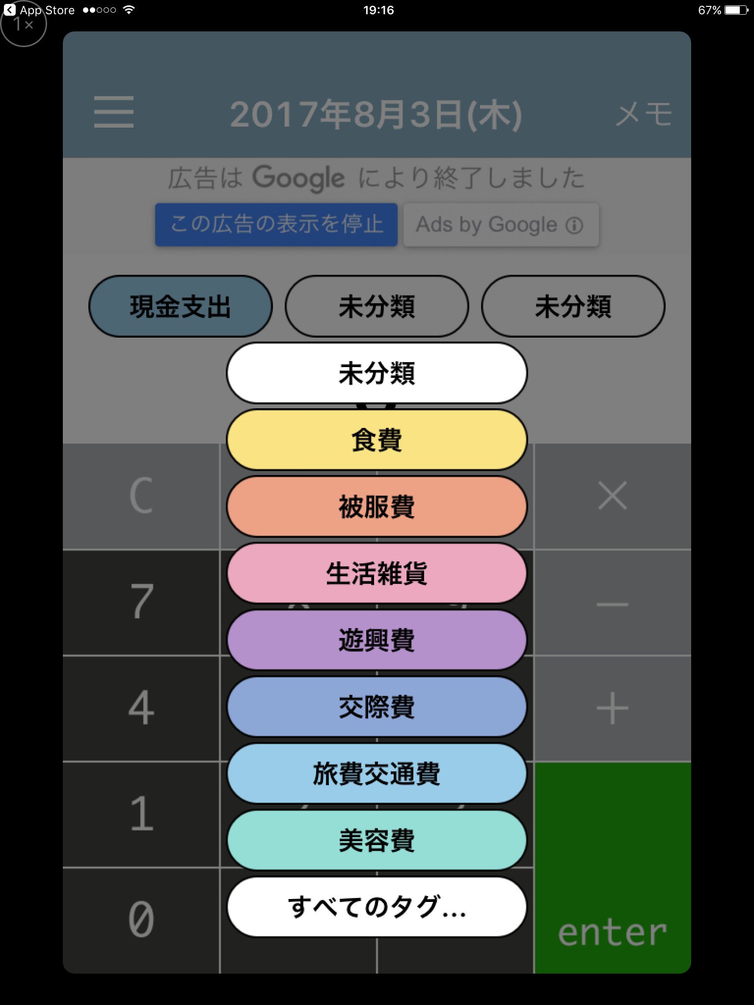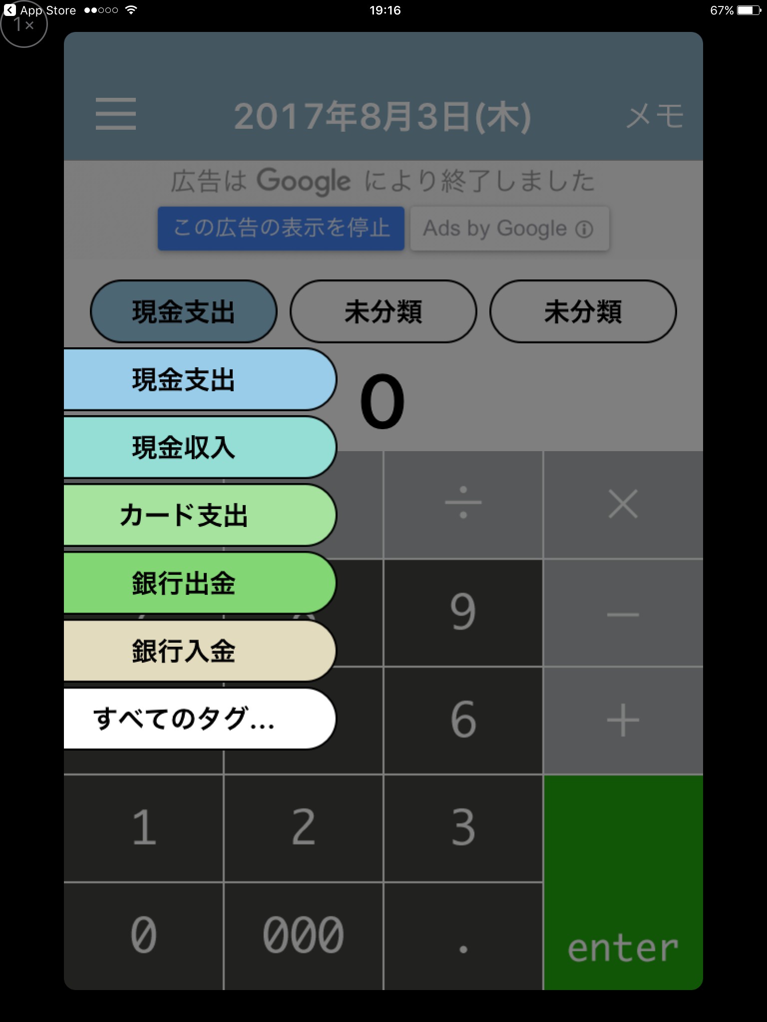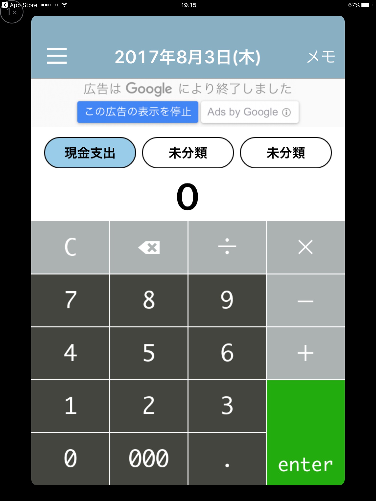 上部にある今日の日付の欄をタップして日付を変更もできます。後は金額を入力すれば完了です。