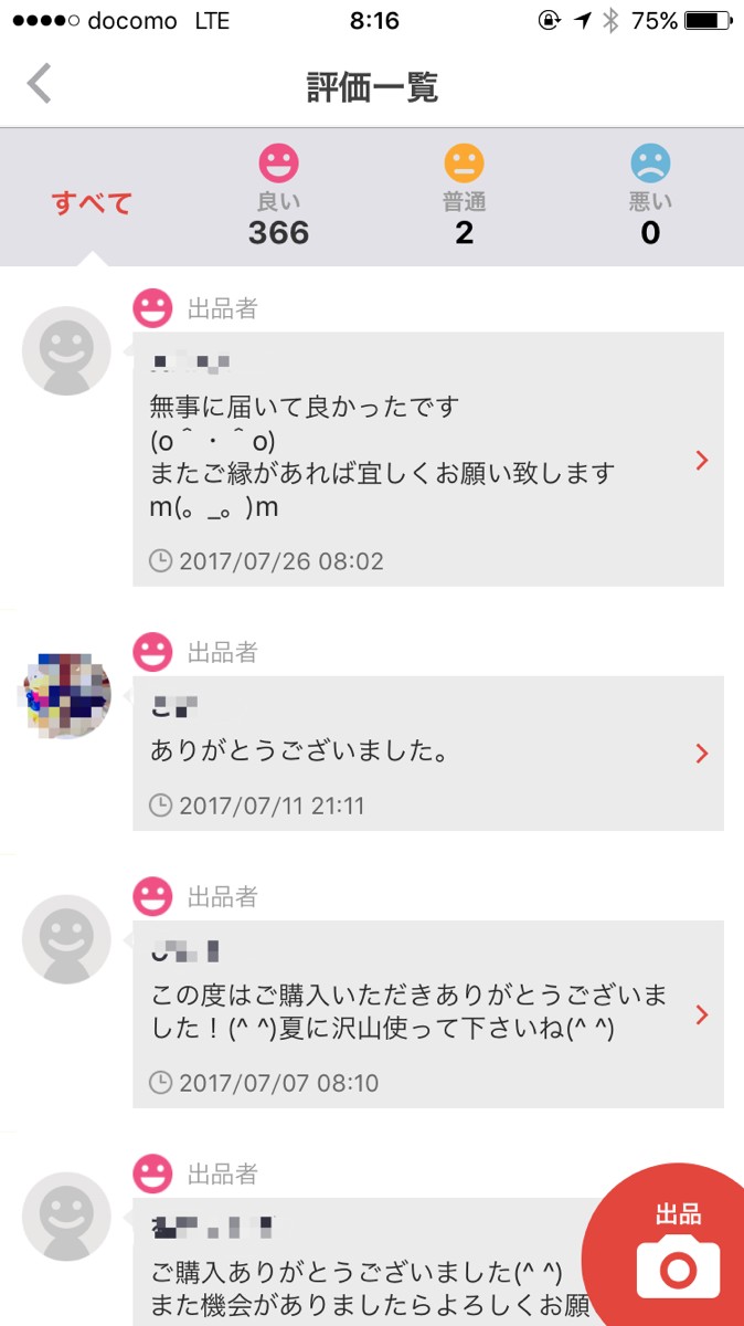 出品しても購入しても取引した相手を「いい」「普通」「悪い」の中から評価します。「悪い」の評価がついた相手とはだれでも取引したくないですよね。「いい」の評価が集まるように誠意を見せましょう。