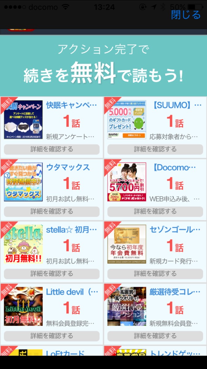 はじめにインストールして読めるのは、10話までです。次からはアプリが用意してあるいくつかのアクションを起こさなければ読み進めません。もしくは、課金をすれば続きが読めます。