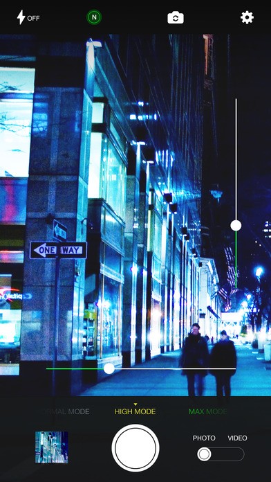 画面上部には他にフラッシュ切り替えや前面カメラへの切り替えができたりと、「Night Mode Camera (Photo & Video)」の操作はほとんどがワンタッチ。