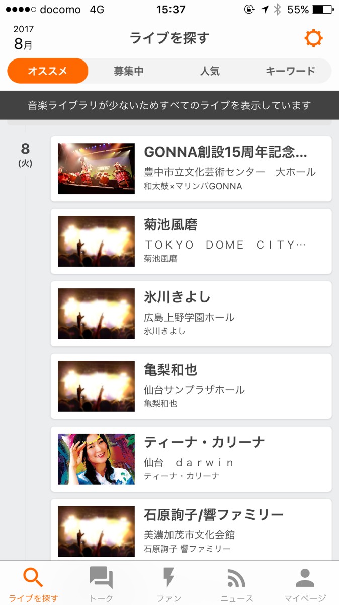 iPhone内に音楽を入れている場合は、そのアーティストのライブを表示してくれます。入れていない場合は、全てのライブ情報が表示されます。