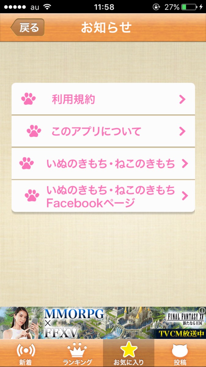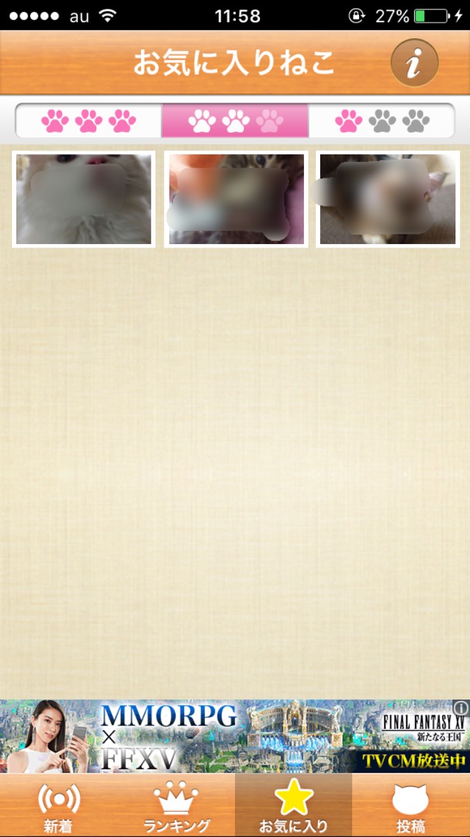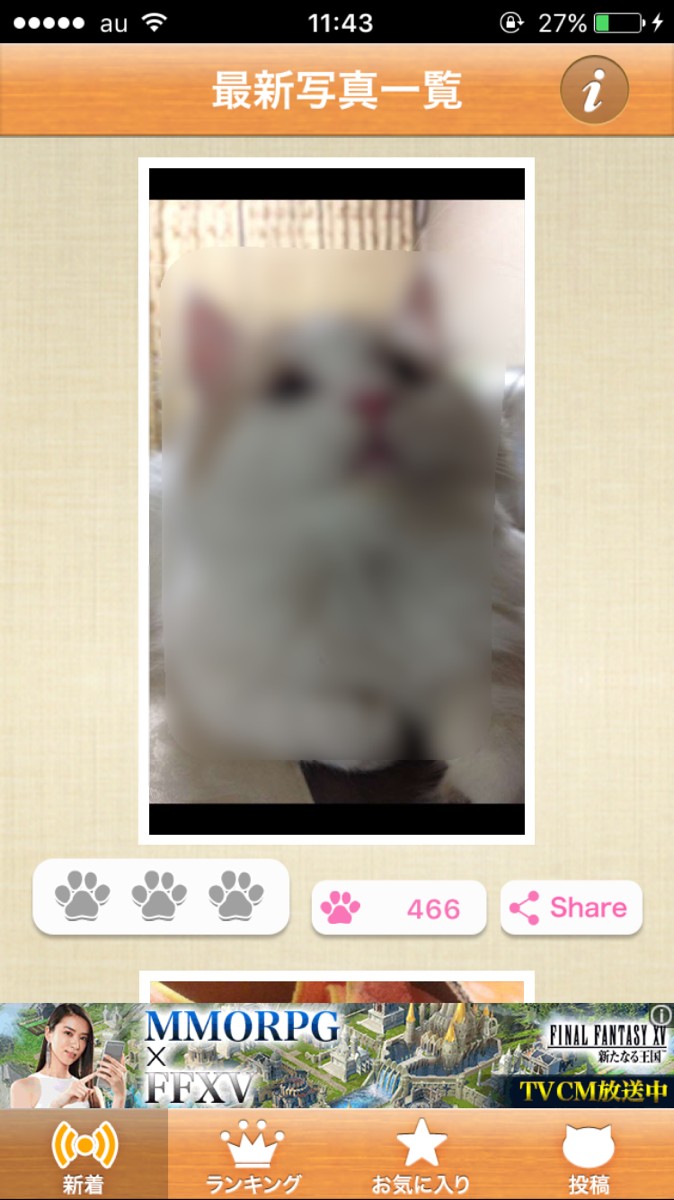 実際にこのアプリを使ってみましょう!アプリを起動すると、新着の猫写真が時系列で表示されます。気になる写真を見つけたら、写真下の肉球マークをタップしてみましょう。3つの肉球の数でお気に入り度を表現できるようになっていて、可愛いですよね。「Share」をタップするとSNSへ投稿もできます。画面下には他画面への切り替えメニューがあります。「ランキング」画面からは、殿堂入り猫や人気猫が見られるので、チェックしてみましょう。「お気に入りねこ」画面では、自分がお気に入り登録した写真が、3つの肉球で表現された段階別に表示されています。お気に入り猫たちで満たされた画面に癒されますよね。自分の写真を投稿したいときは、「投稿」画面から行います。SNSと連携した投稿もできますが、このアプリ内だけに限定した投稿も可能です。もし操作方法が分からなくなったときは、画面右上の「i」マークをタップしてみましょう。アプリの使い方を確認することができます。