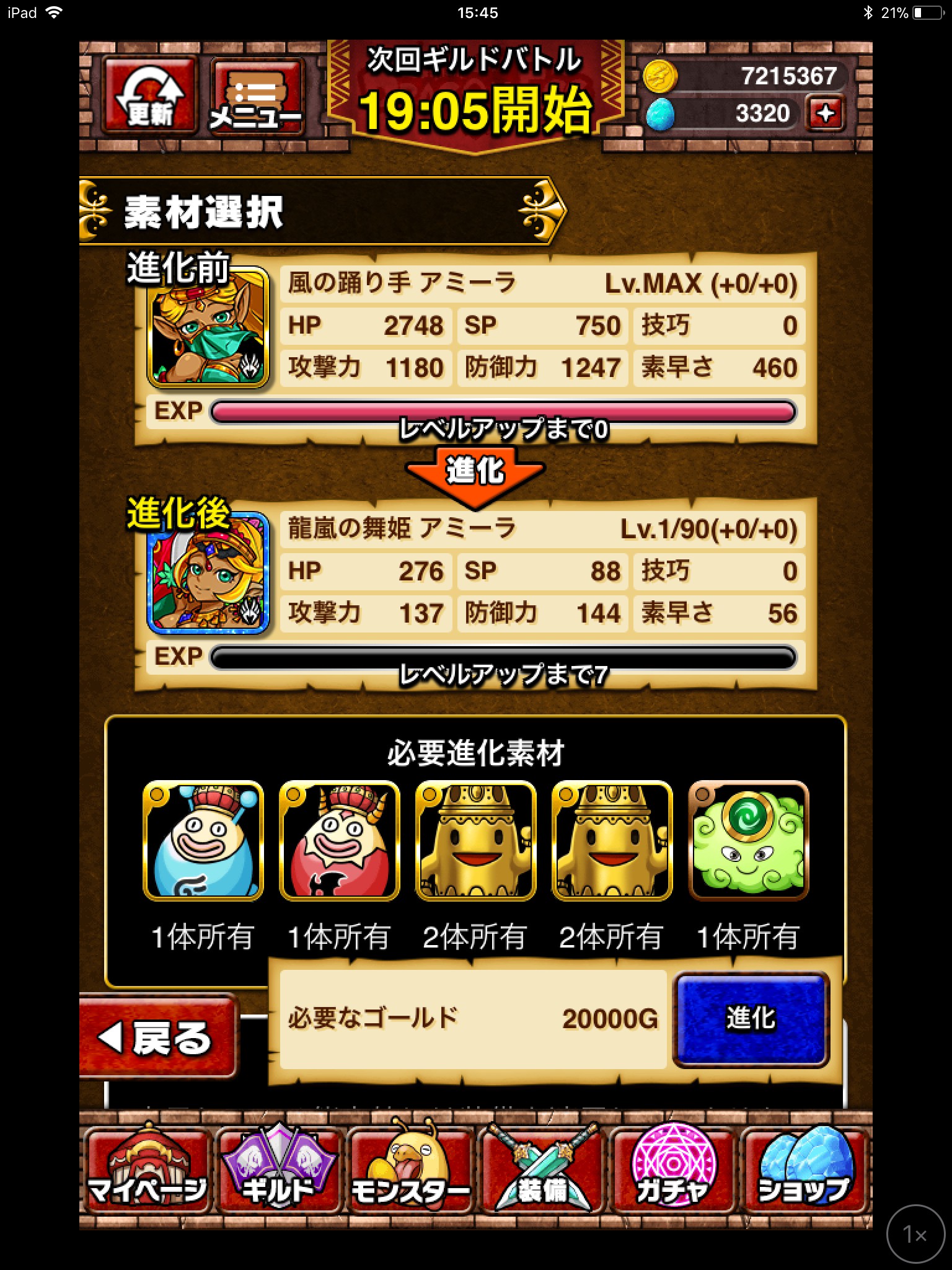 モンスターのレベルをマックスまで上げたら、さらに強力なモンスターにするためモンスターを進化させてみましょう。モンスターによって進化のために必要な進化素材や進化回数が異なるので、モンスター一覧で進化条件を確認しておくと効率的です。