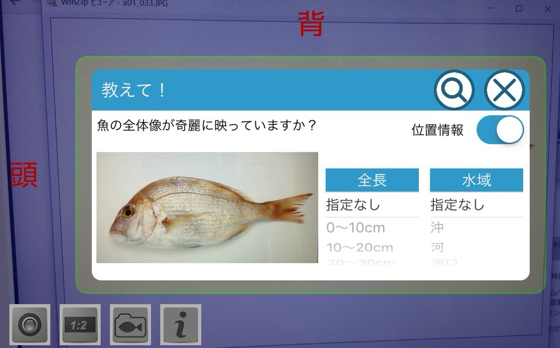 このように簡単に魚の名前を調べることができます。判定の精度を上げるためには、形がはっきりと分かる平らな場所、例えばまな板やコンクリートの上などに魚を置いて撮影すること、撮影枠内にしっかりと魚全体を納めることがポイントです。撮影時には照明の切り替えや魚の大きさに合わせた縦横の比率調整ができるので、これらの機能を利用すれば撮影の精度をより高めることができます。さらに、手順3の時に表示される位置情報の可否や全長、水域を設定すればより正確な判別が可能です。