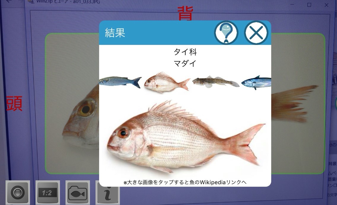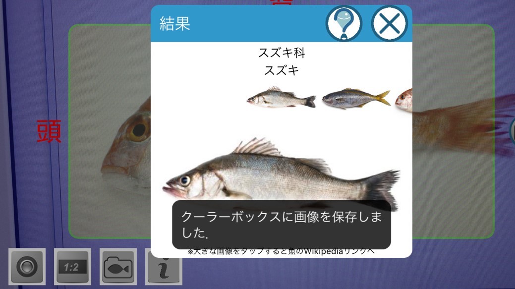 検索の結果画面に表示される大きな魚の画像を長押しするとWikipediaの情報が取得できます。魚の特徴などのより詳しい情報を見ることができ便利です。