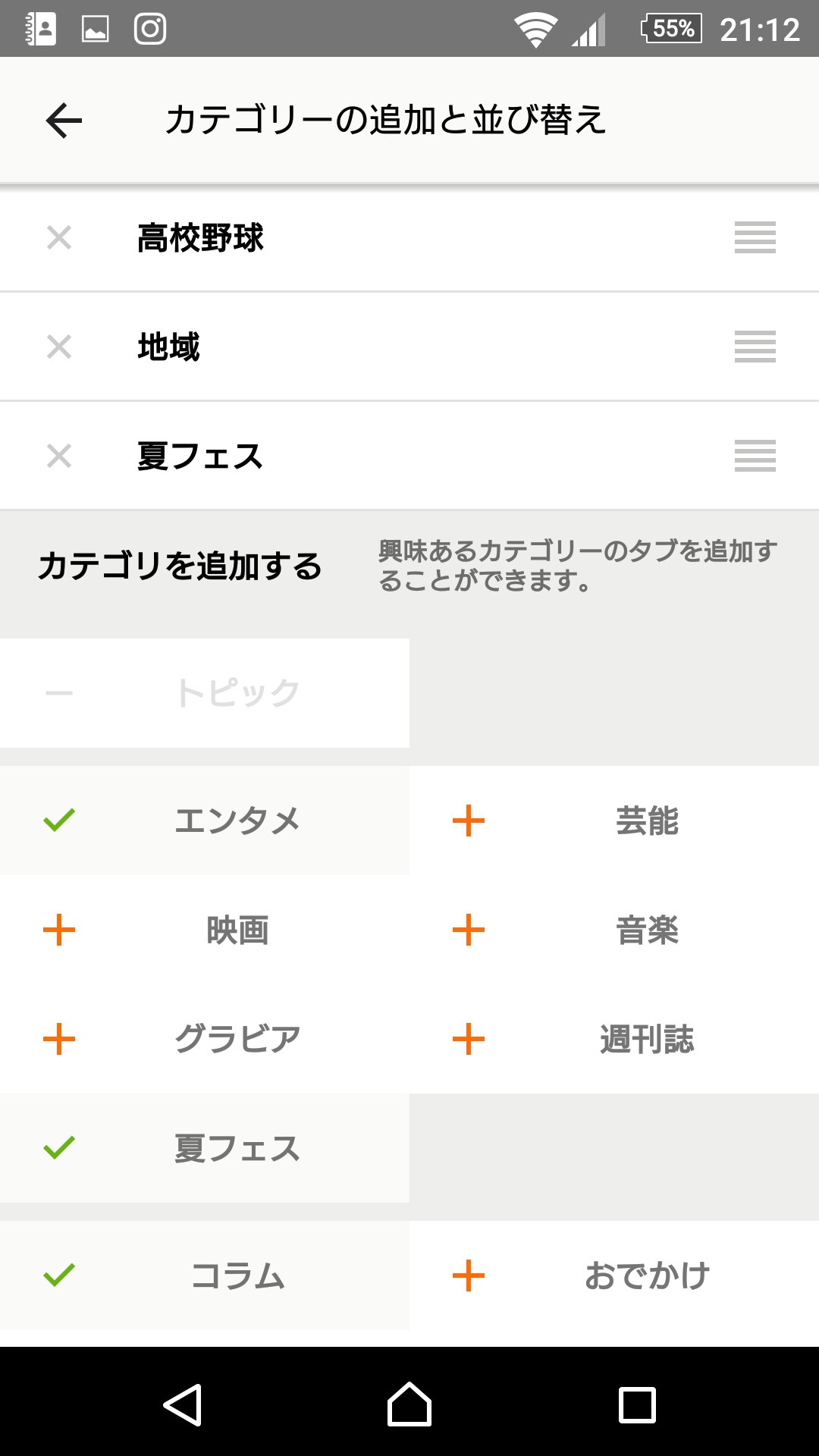 ・右上プラスボタンで気になるカテゴリーを追加・削除可能