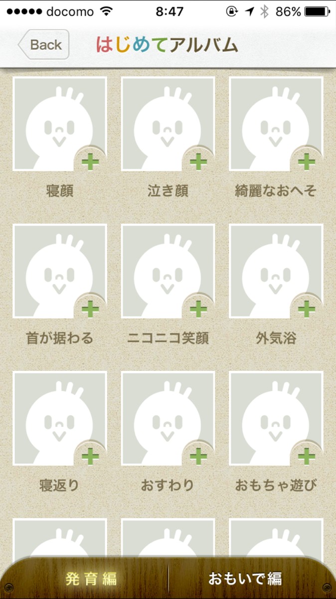 「はじめてアルバム」は、あらかじめ設定されているフレームをタップして、写真をはめこんでいくようになっています。