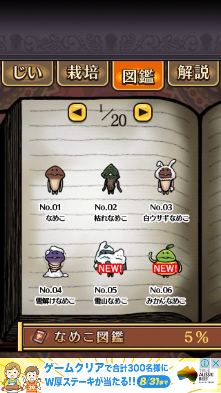 なめこ図鑑に新種のなめこをどんどん登録して、なめこ図鑑を充実させていきます。ひとつひとつのなめこに、細やかな説明が書いてあり、見ていて飽きません。なめこ図鑑を眺める時間は、至福の時間です。