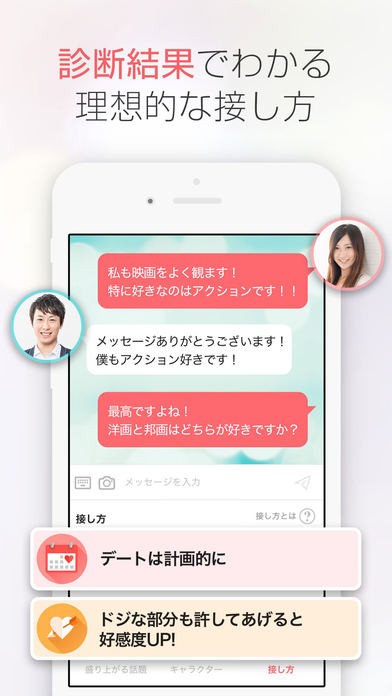 ・相手から「ありがとう!」が返ってきたら、メッセージ交換開始!あとは、事前に性格診断で教えられた恋愛の傾向とアドバイスを参考に、恋愛しましょう!共通点から弾む会話に相手も自然と心を許し、気づけばお互いになくてはならない親密な関係になっているかもしれません。まさに運命の相手と出会いが叶う恋活、婚活アプリでしょう。