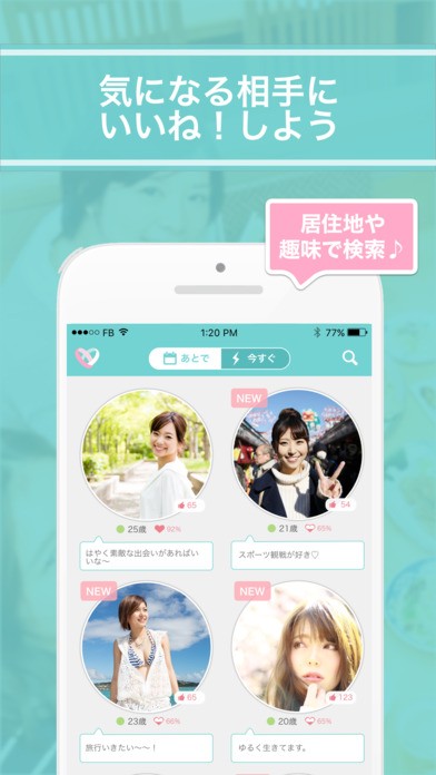 アプリは、すぐに出会う目的以外にも出会いが探せます。メニューバーの「さがす」から「あとで」を押すと、異性の顔写真一覧が表示されます。気にいったら「いいね」を押し、相手からも「いいね」をもらえると、メッセージのやりとりができるようになるので試してみてください。