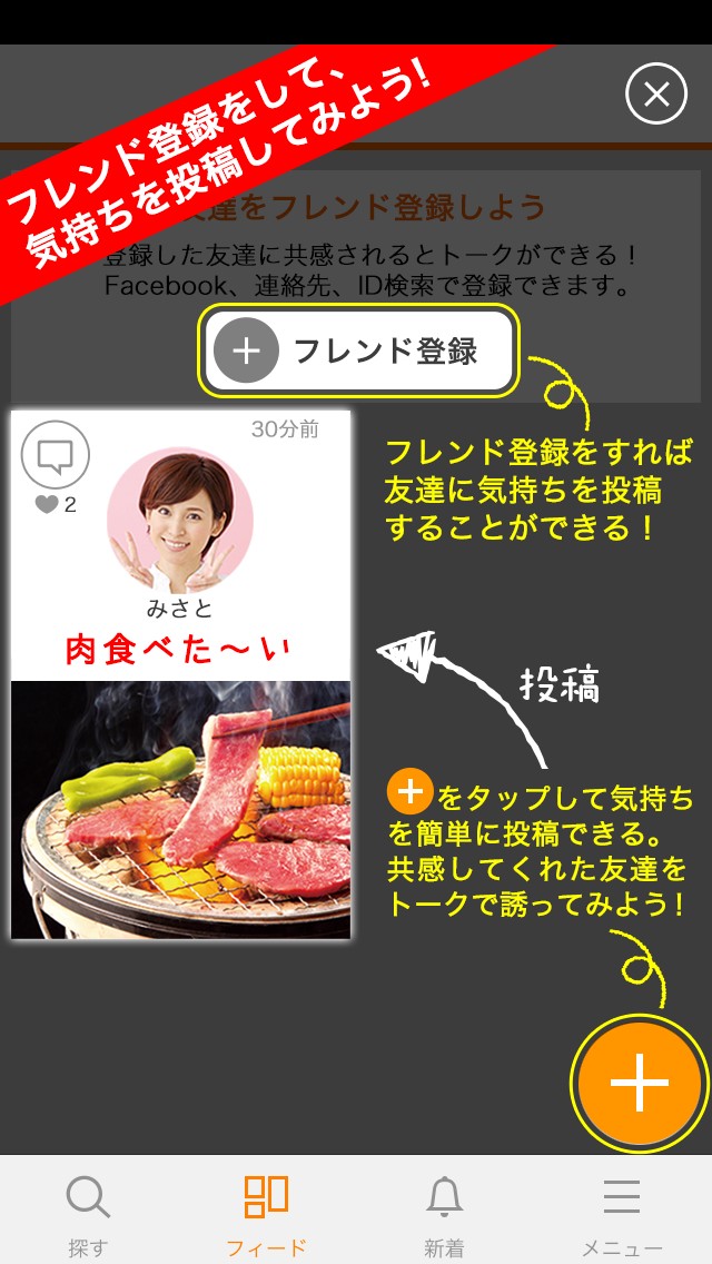 画面下部の「フィード」をタップします。「フレンド登録」をタップして、「連絡先から探す」、「Facebookから探す」、「フレンド招待状を送る」を選択して友達を登録しましょう。