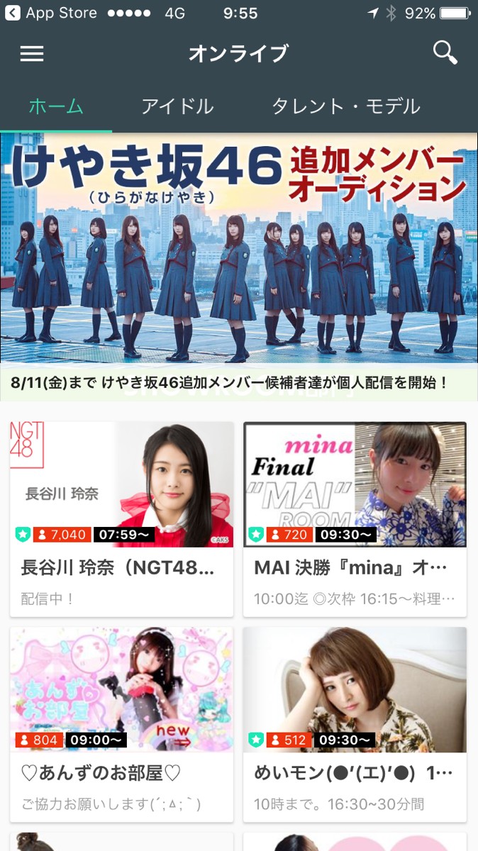 「オンライブ」か「タイムテーブル」から選べます。「オンライブ」の中でもアイドルやタレント、ミュージック、アマチュアなどのカテゴリーに分かれているので、きっとあなたの好きな配信が見つかるはずです。今回は「けやき坂46」の追加メンバーオーディションを視聴します。