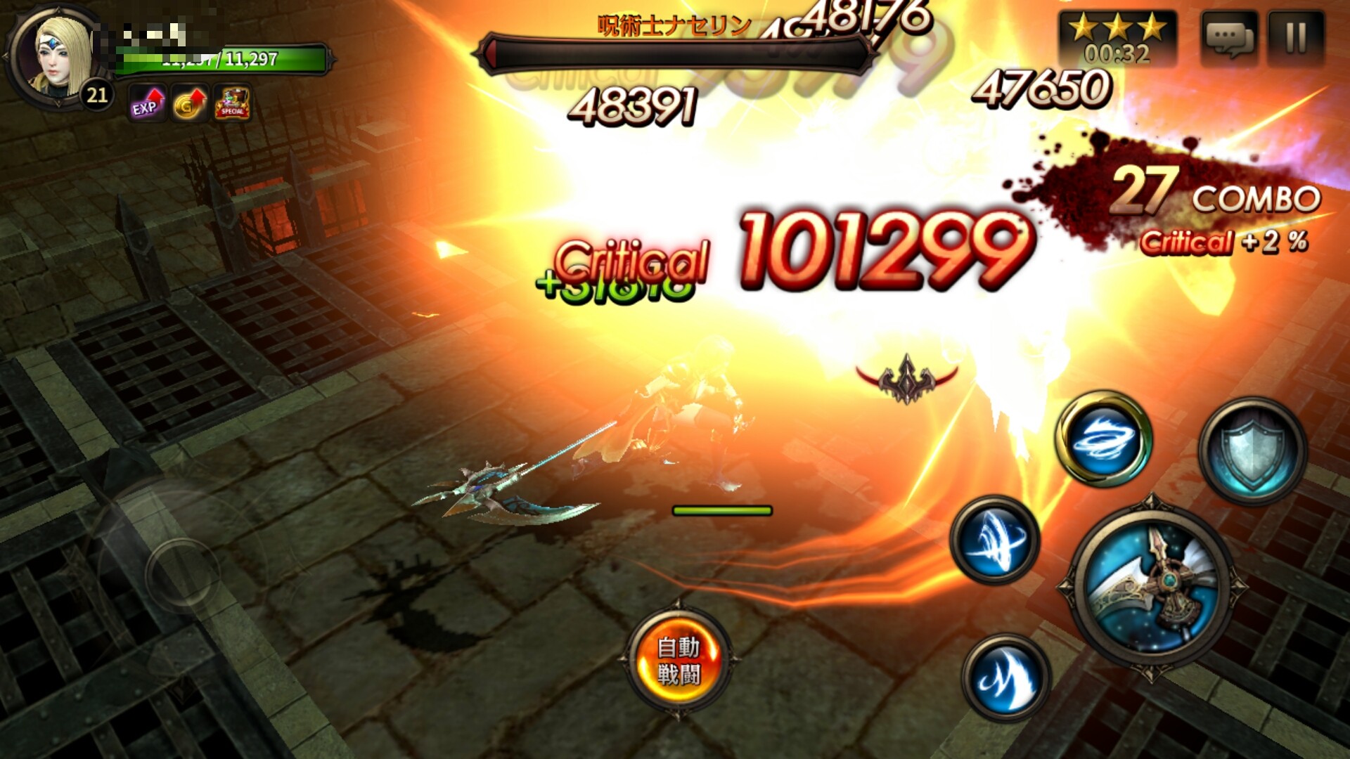 仮想パッドでキャラクターを移動させながら、敵に向かって攻撃ボタンを連続でタプすればコンボが繋がっていきます。