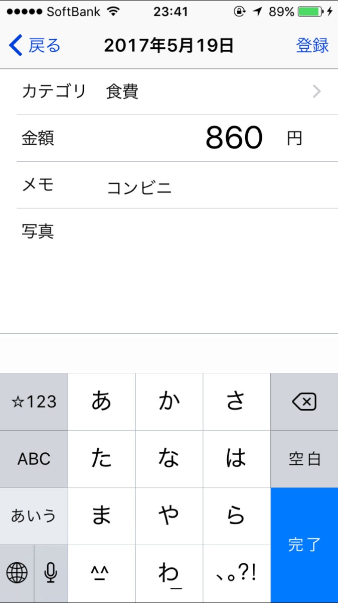 起動時には今日の日付が選択されているので家計簿をつける時にはそのまま「新規登録」をタップし必要事項を入力すれば完了です。