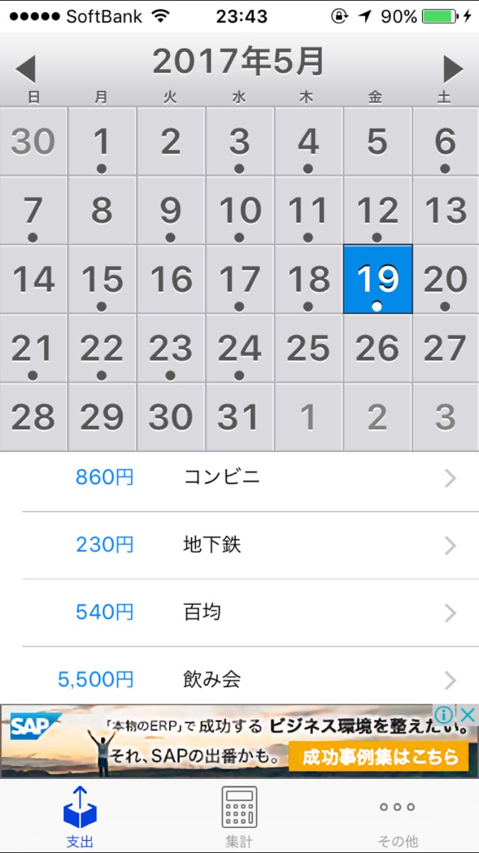 最もそれを感じるのが、金額を入力する「新規登録」ボタンです。スマホを片手で持った時にちょうど親指が来る場所に配置してあり、ストレスなく金額の入力画面に移動できます。