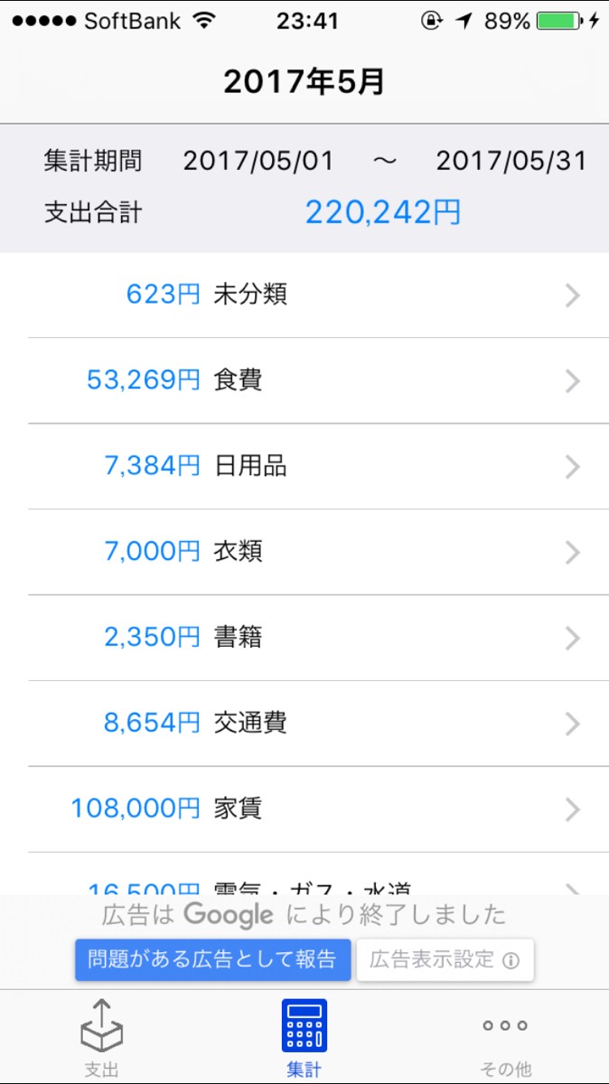 「集計」ページではひと月の支出合計が出てくるので使いすぎているかどうかがよくわかります。
