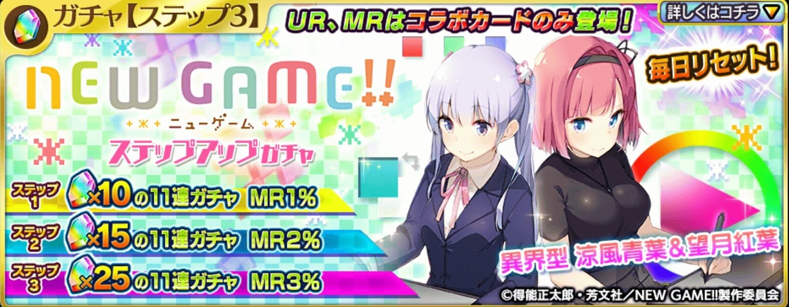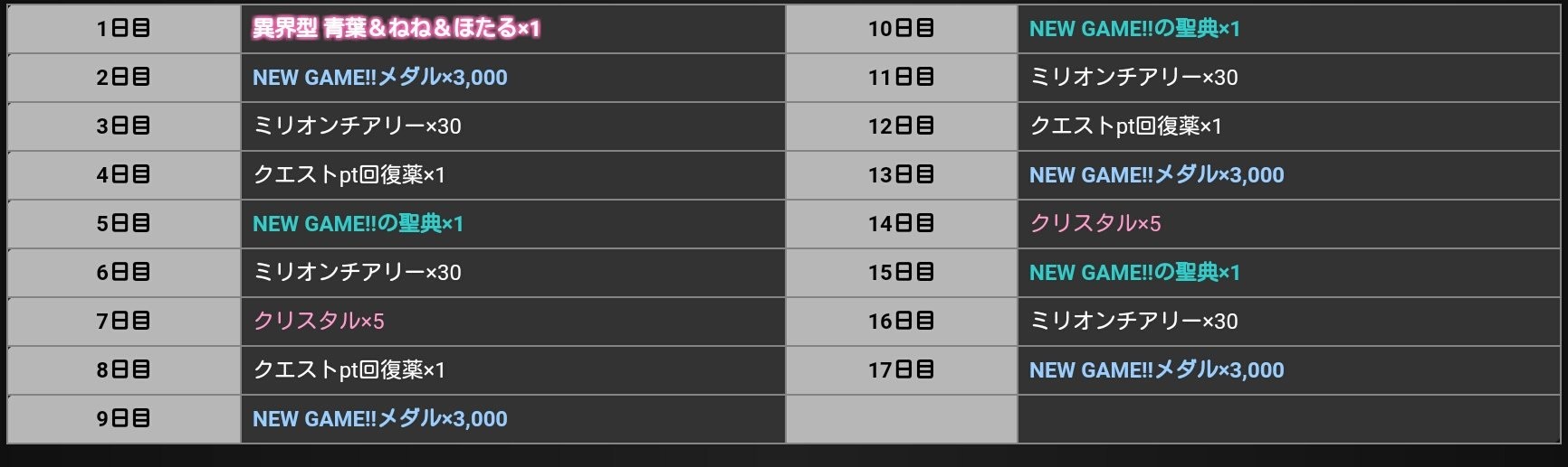 NEW GAME!!メダルを集めることで、「イベント騎士カード」やイベント騎士カードの「MR+」「MR++」への因子覚醒素材「NEW GAM!!の聖典」などとの交換が可能です。