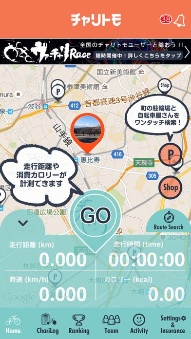 ホーム画面のマップの現在位置に自分のアイコンが表示されます。自転車で出かける前に”GO”をタップします。これだけで「チャリトモ」が”チャリログ”を記録してくれます。