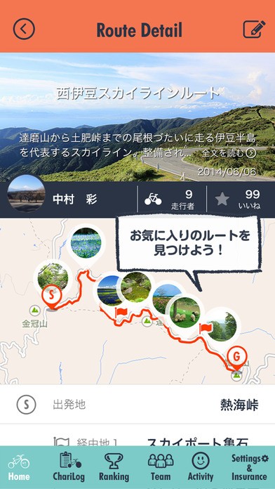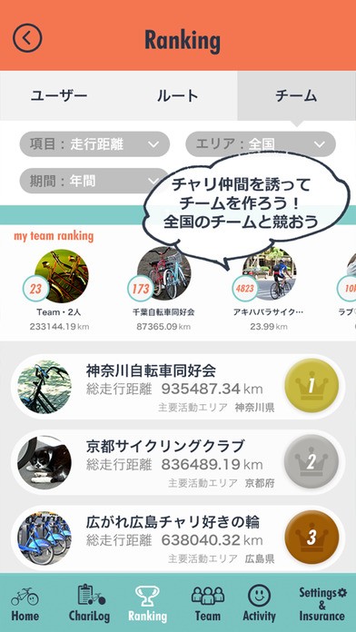 「チャリトモ」ユーザーが作るチームに参加して、自転車好きな仲間を見つける、ランキングや”ヴァーチャリレース”に参加するといった自転車に乗るのに便利な機能が充実しています。