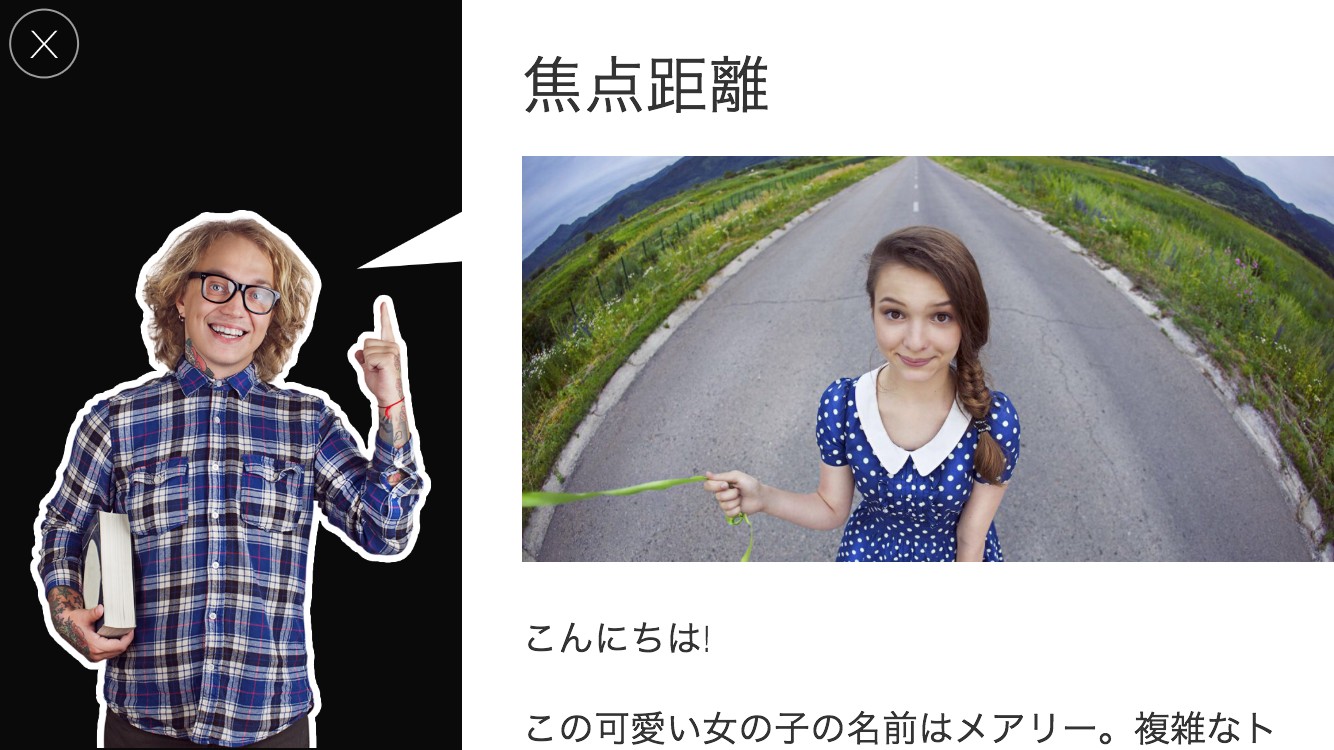 「The Great Photo App」は、3つのカテゴリの教材があります。その一つ目が、”レンズ”についてです。レンズにはたくさんの種類がありますが、それぞれの特徴を理解してますでしょうか?遠くの被写体を撮るなら望遠、視野を広く撮りたいなら広角など、簡単なレンズの特徴は知っているかもしれません。しかし、レンズが変わると、被写体と背景の距離や、一眼レフ独特のボケの出しやすさ等、同じ被写体でも、色々な点で、写真の印象が変わってくるのです。「The Great Photo App」を使えば、このようなレンズによる違いを分かり易く解説し、尚且つ、アプリに内蔵されているサンプル写真を、色々なレンズに変えて、どのような写真になるのか目で見ることも出来ます。