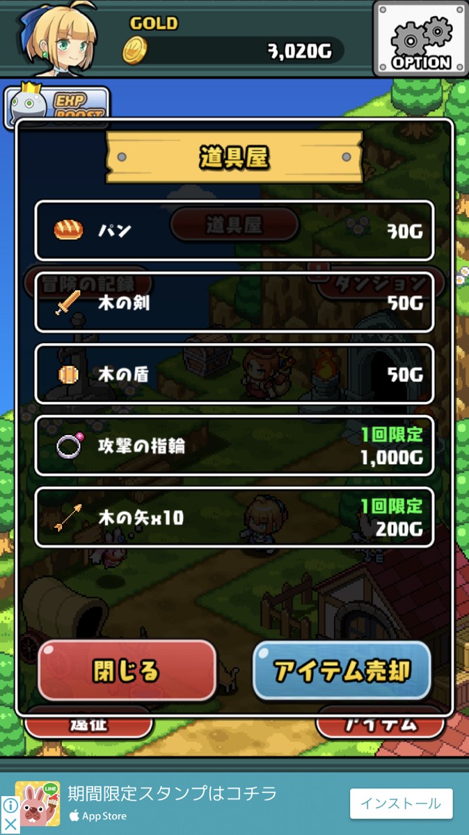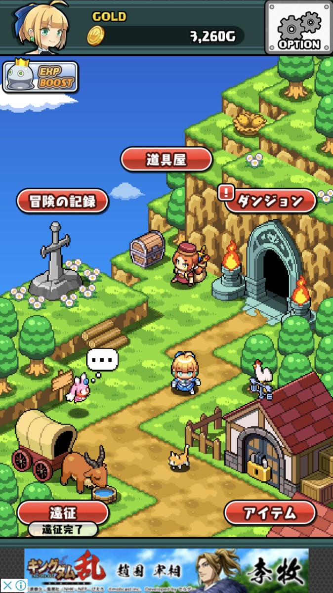 ダンジョンの他に、遠征コースが用意されています。遠征はチケットを使って行い、主人公のお供、妖精ブルーが遠征に出かけてくれます。遠征は時間経過で行ってくれるので戦う必要はありません。遠征では貴重なアイテムを持ち帰ってくれるので、ダンジョン挑戦前に、ブルーを遠征に出しておくといいでしょう。