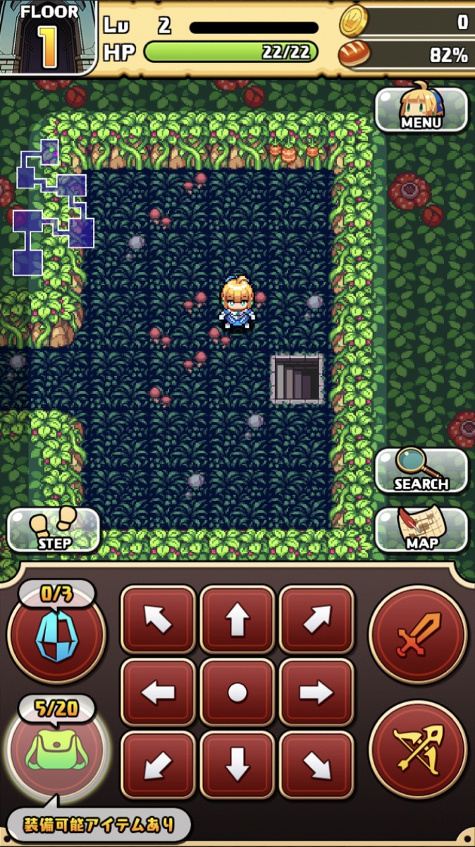 キャラクターやダンジョンはドット絵で描かれ、どこか親しみやすさを覚える人も多いでしょう。ボタンもわかりやすく、大きい矢印が表示されるのでキャラクター移動が簡単にできます。