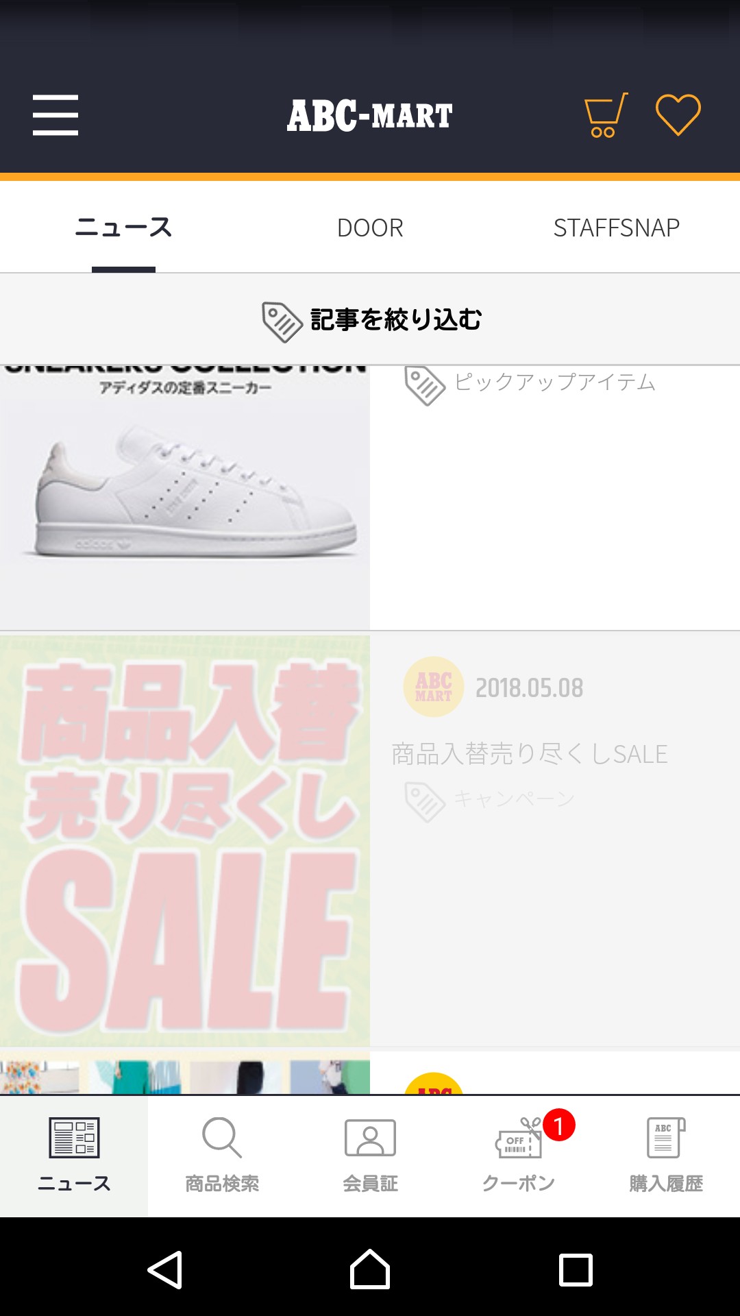 「ABC-MARTアプリ」内にあるニュースでは、話題の商品や季節のおすすめ商品特集の記事を読むことができます。