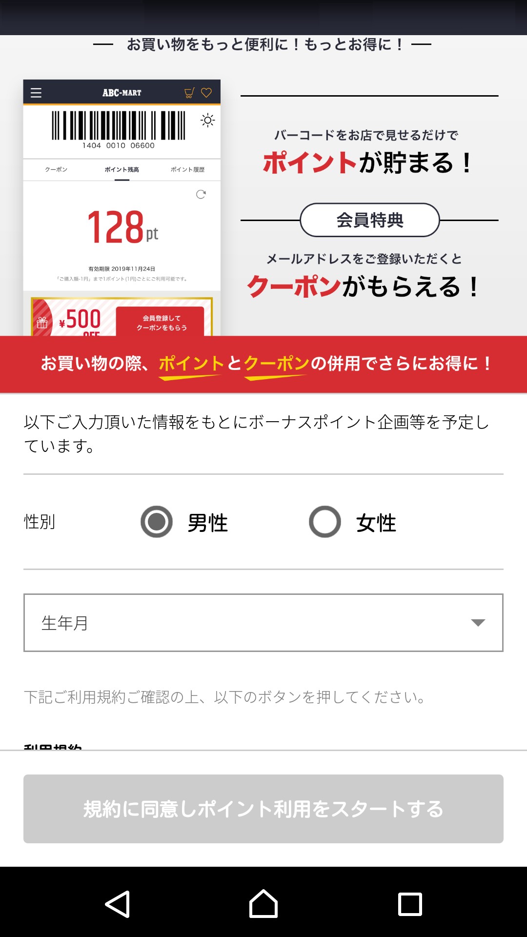 - 「性別」にチェックを入れ、「生年月」を選択し利用規約を確認したら「規約に同意しポイント利用をスタートする」を選択します。