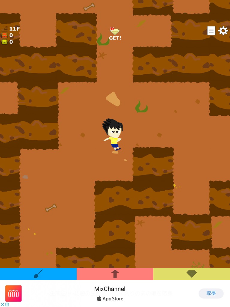 気がつけば野外に放り出され、そばにあるのはスコップのみ。ひたすらに下へ掘り進み脱出を計画するゲームアプリです。タップしてザクザク掘り進みましょう。移動は画面の左右をタップ、掘れる方向は左右下で上にはできません。道中には宝箱があり、中にはスコップの強化や、宝箱出現率アップのレベルを上げるために必要な素材が入っています。スコップには攻撃力があり、一定の値を超えないと先へ進めません。ですからある程度進んだら戻ることを繰り返すことになります。ただ掘るだけなのになぜか遊んでしまう、そんな中毒性をもつゲームです。