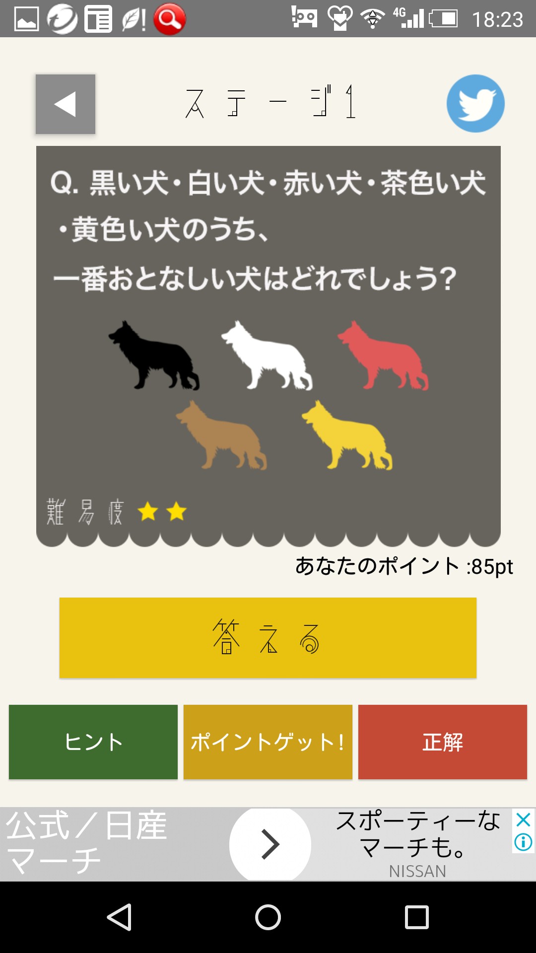 全100問で構成されているなぞなぞのゲームアプリです。「大人」と書かれているとおり難易度は高めの問題が多いです。中には選択式のものもありますが、解答は手打ちで文字入力しなければならないので適当にやれば答えが分かるわけではありません。頭を悩ますという意味では歯ごたえ十分で、暇つぶしの時間になってくれるでしょう。もしどうしても分からなければポイントを消費してヒントを覗いてみましょう。ポイントは最初から100ポイント所持していて、動画広告を見ることで増えるので実質無制限にヒントをもらえます。