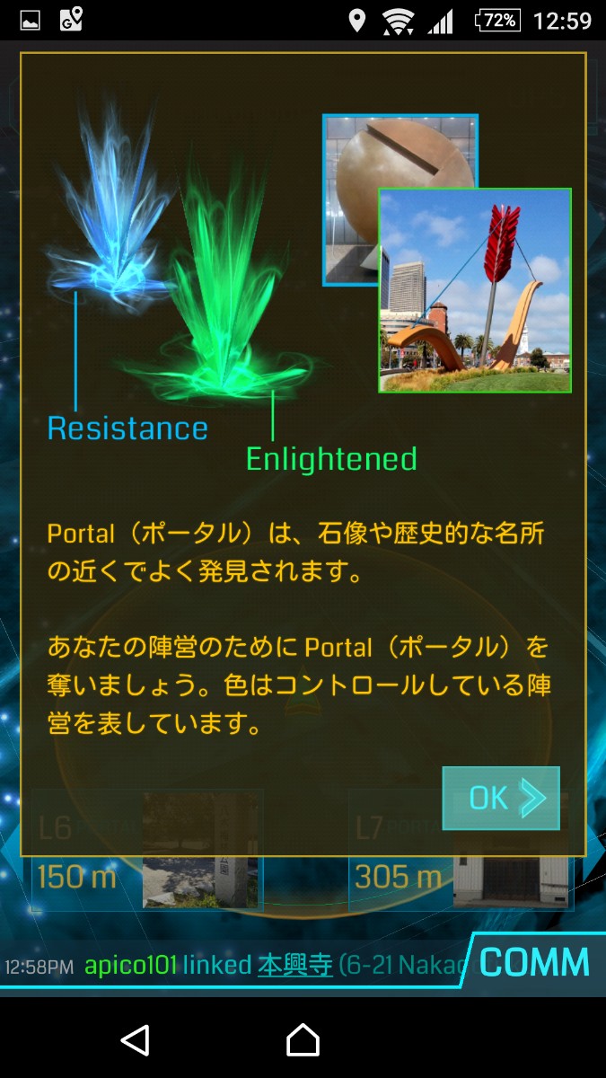 ・ポータルを巡りアイテムを収集。レベルをあげて敵の陣地を奪い、ポータル同士を繋ぎ、自分の陣地を作ります。(ポータルは公園や建造物などの場所にあります)ポータル同士を繋ぐにはポータルキーというアイテムを使用しなければなりません。このアイテムは、ポータルをHACK(ハック)することで入手することできます。HACKは連続で行うことができないので注意しましょう。ポータルをHACKすることで、いろいろなアイテムを入手することができます。アイテムは陣地を奪う時や、自分のポータルを強化する場合など、さまざまな場面で使うので、いろいろな場所のポータルを歩いて見つけてアイテムを取得してください。