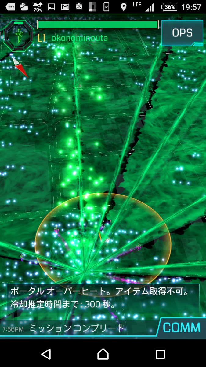 ・アプリを起動したまま、実際に歩きます。(マップ内の三角形が自分の現在地を表しています。白、水色、緑色の光が噴き出しているところがポータルの場所です)