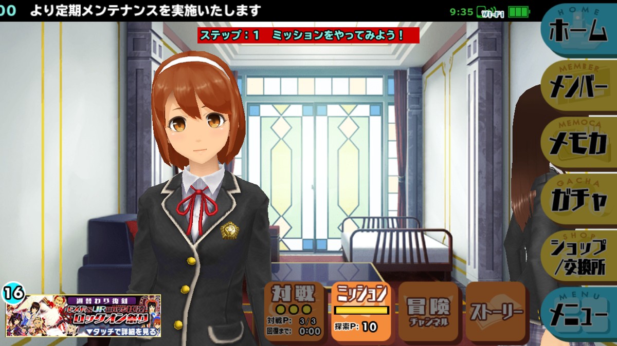 画面下にあるミッションボタンをタップしてストーリーを進めていきます。ここでのポイントは、主要キャラクターに都度話しかけ敵を検索することです。話しかけると検索Pが1つ消費されますが、3分経つと1つ回復するのでドンドン話しかけましょう!すべての敵を倒せばミッションクリアです。