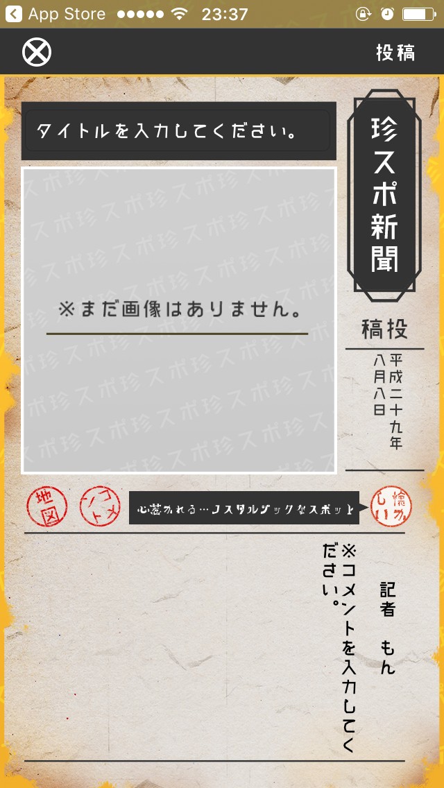 4、「珍スポ新聞」の画面になり、写真を選んで入れたら「タイトル」・「コメント」を入力する